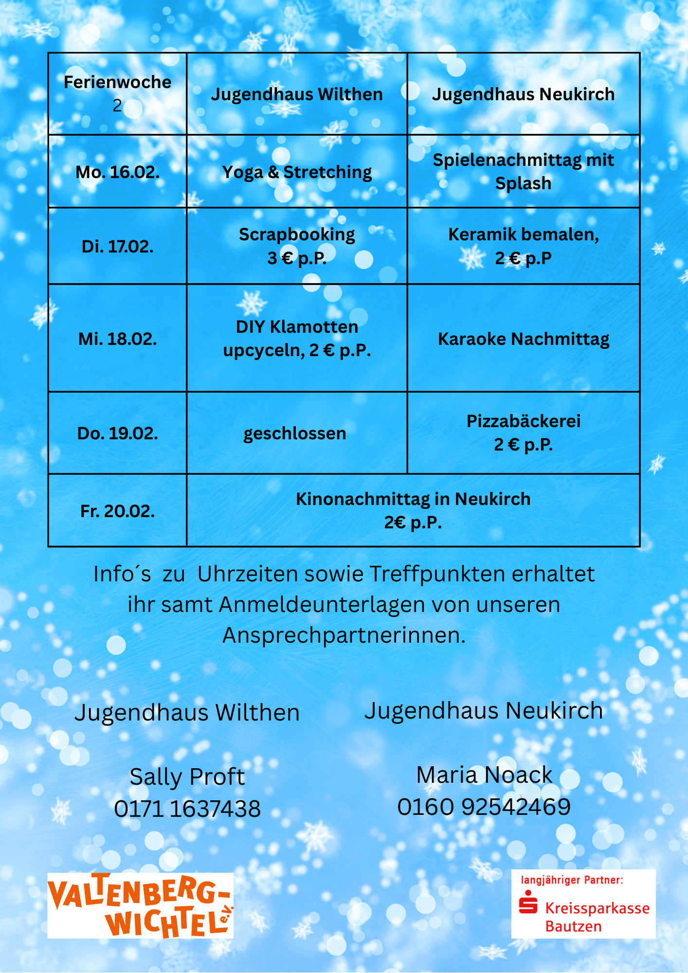 Die Winterferien stehen vor der Tür und wir haben uns ein spannendes Programm für euch überlegt. Meldet euch also schnell an, denn einige Plätze sind begrenzt. WIr freuen uns auf euch 🙂